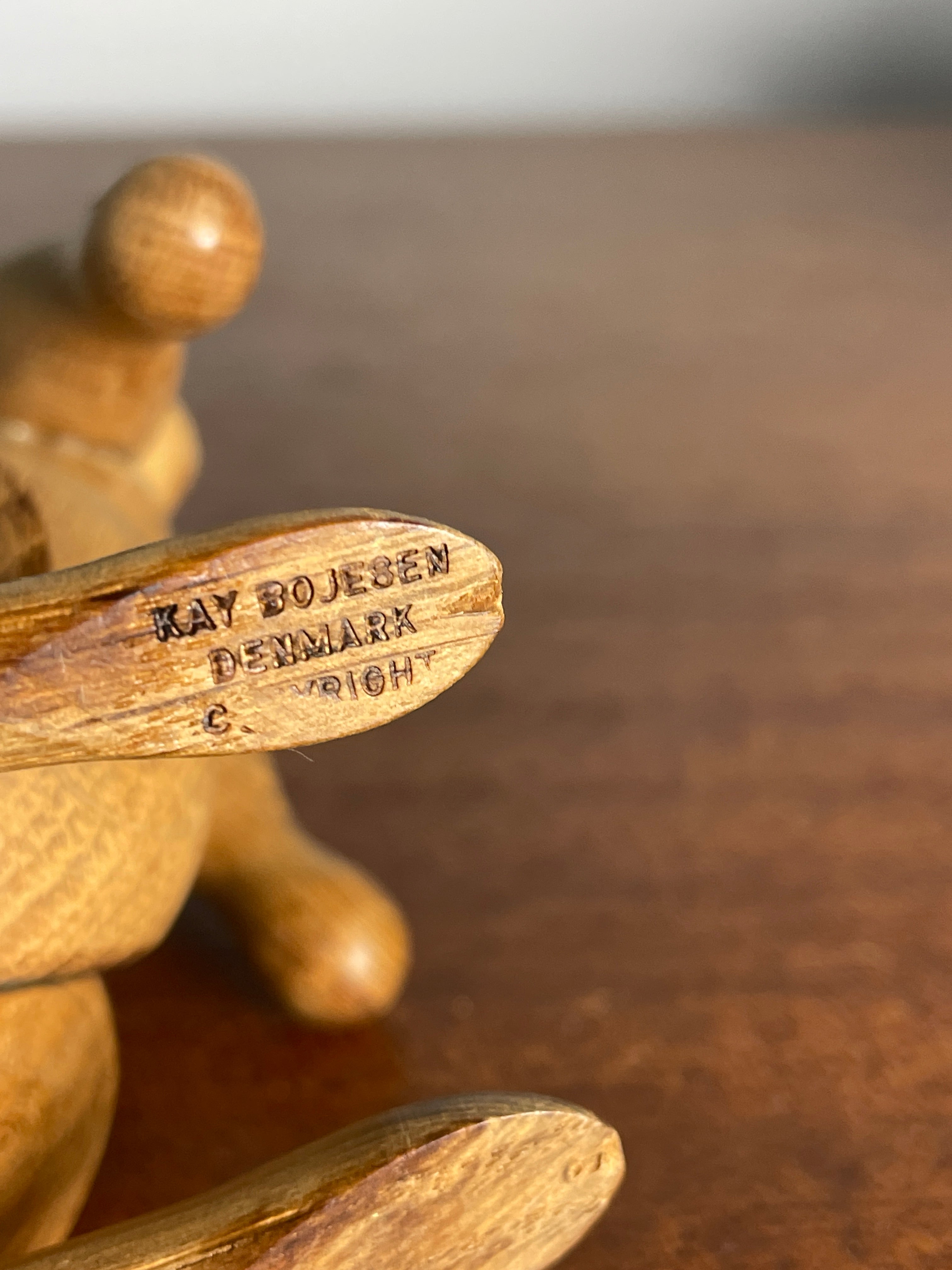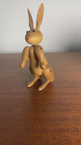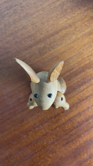 This little oak rabbit is the most charming creature and has a delightful look of surprise on his face. His ears are perked up to catch the conversation. His limbs has been glued by the previous owner and do not articulate. A lovely piece alone or to add to a collection of Kay Bojesen animals for any Danish Modern collector. Bottom of foot marked “Kay Bojesen | Denmark