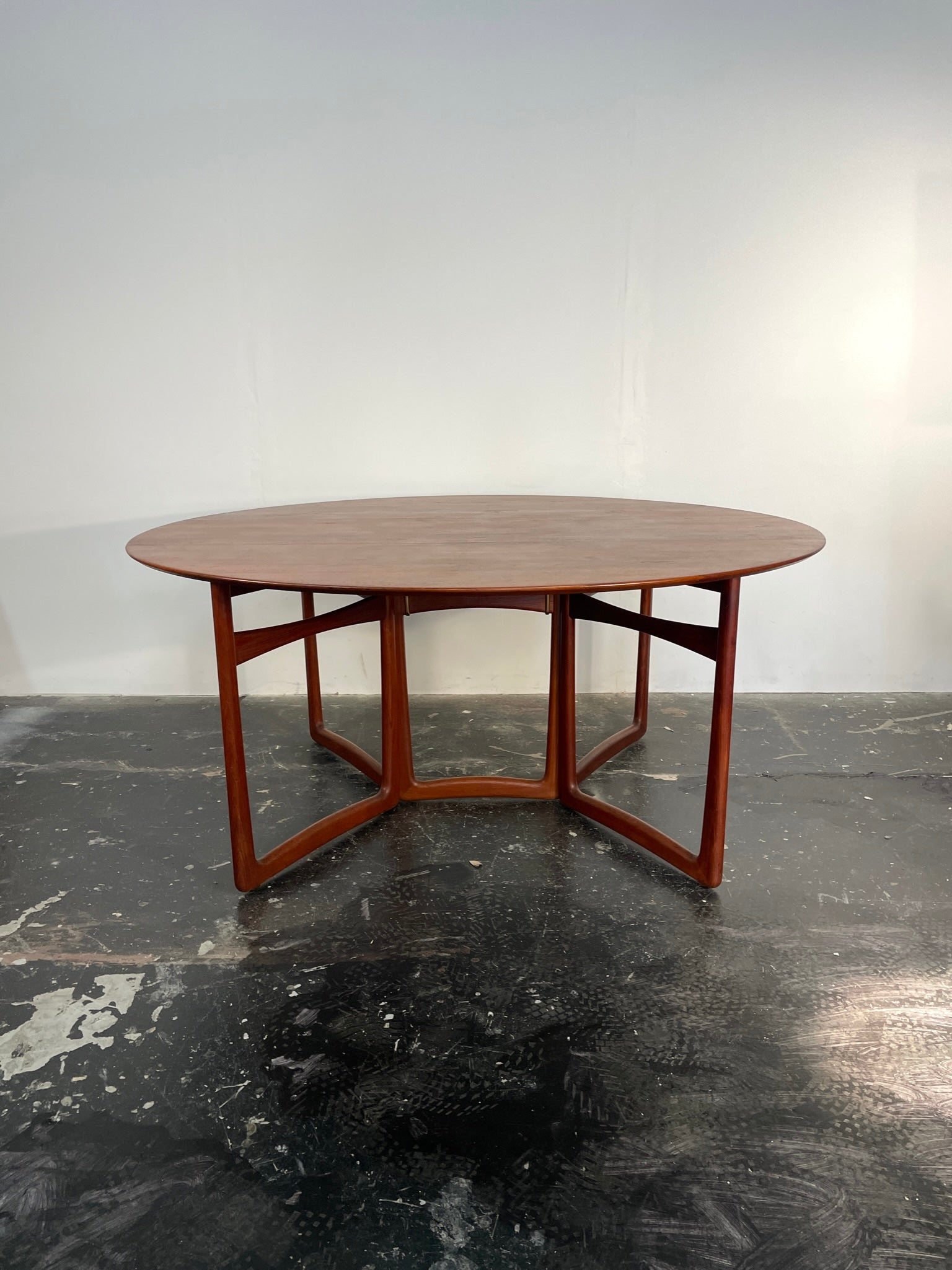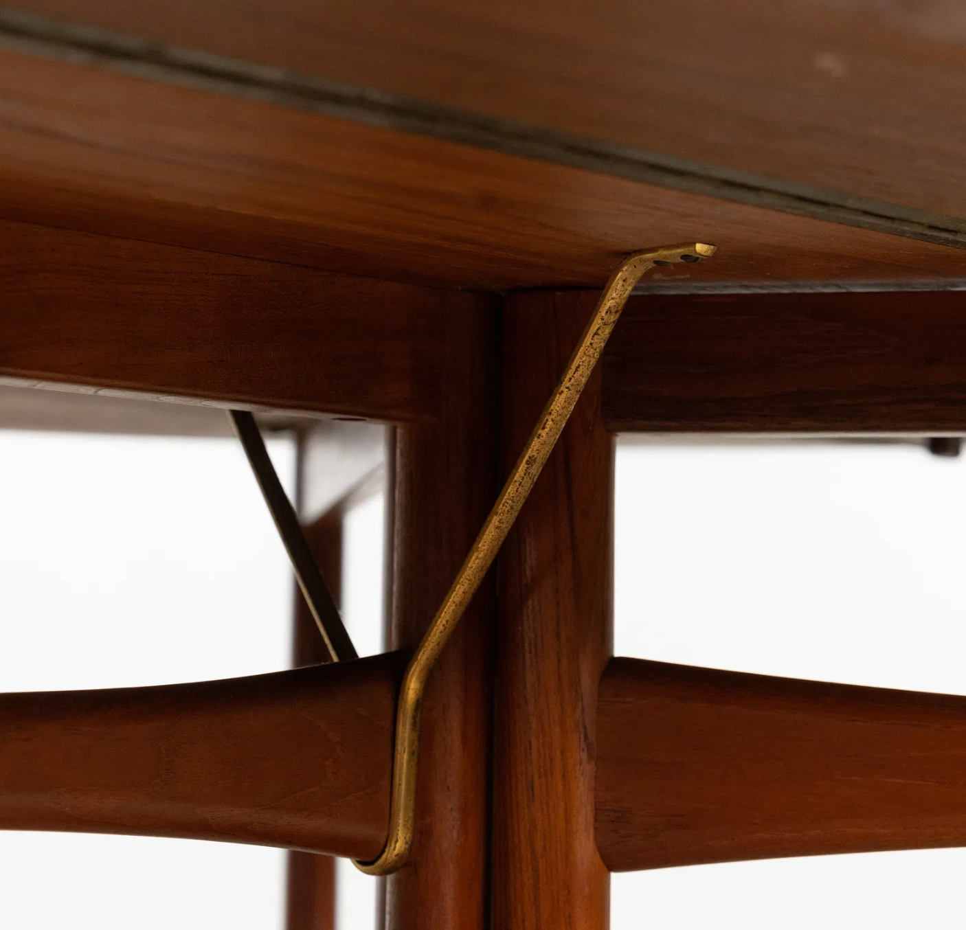 A solid teak, drop leaf dining table by Peter Hvidt and Orla Molgaard-Nielsen for France & Son Denmark. Beautiful high quality construction with amazing brass details.ย
