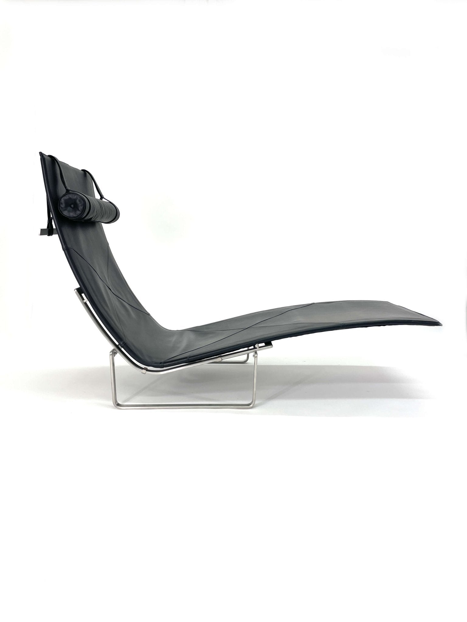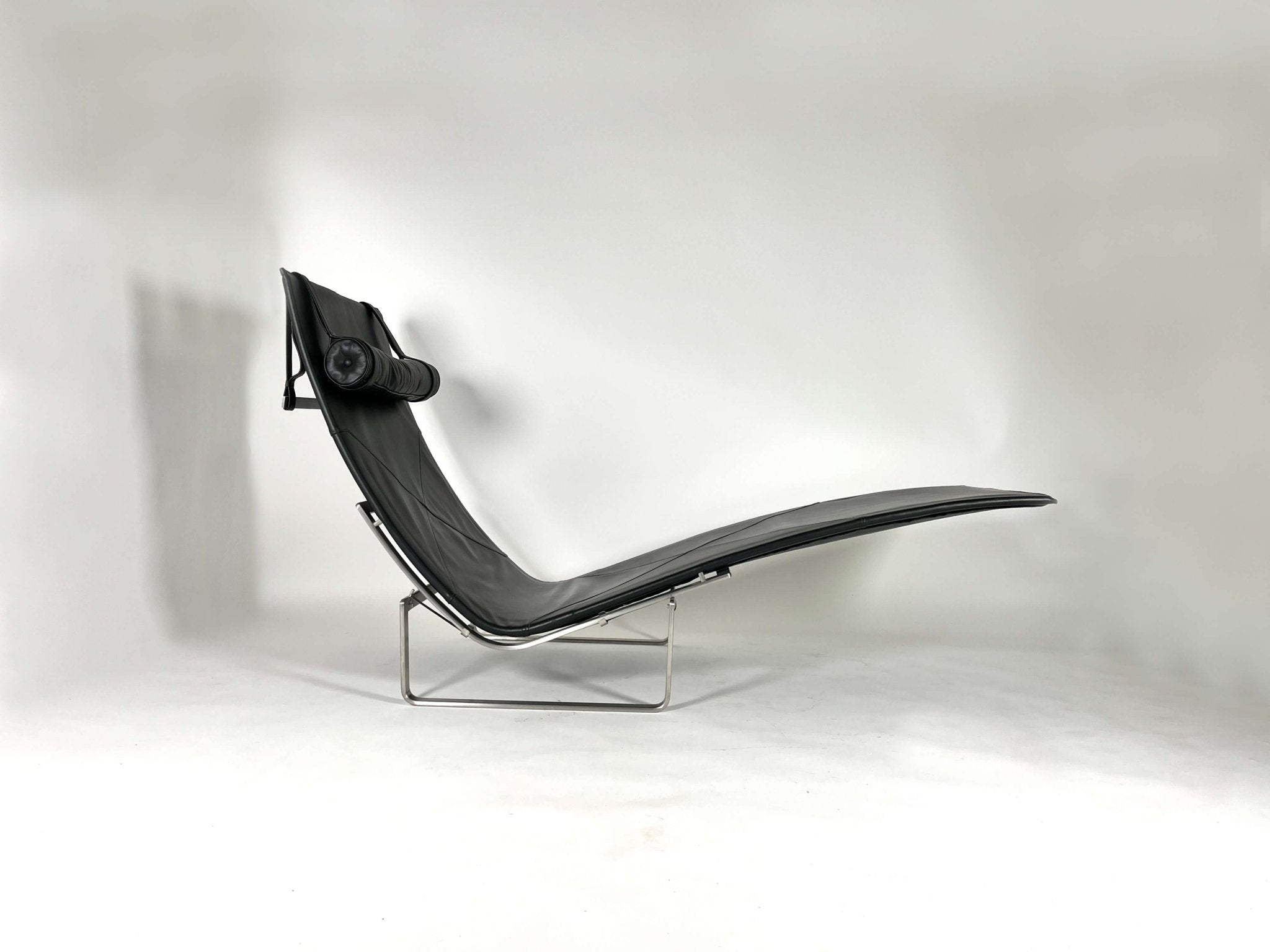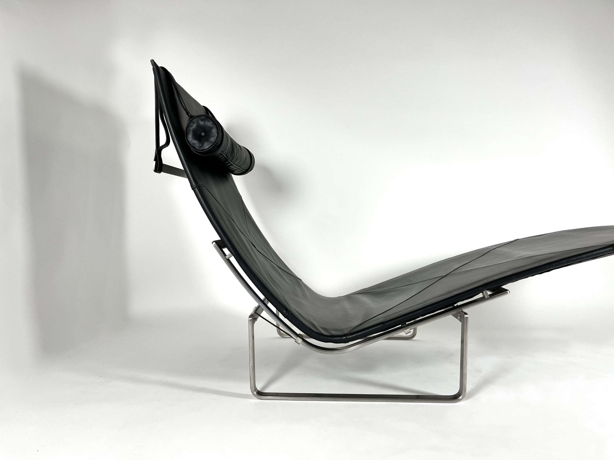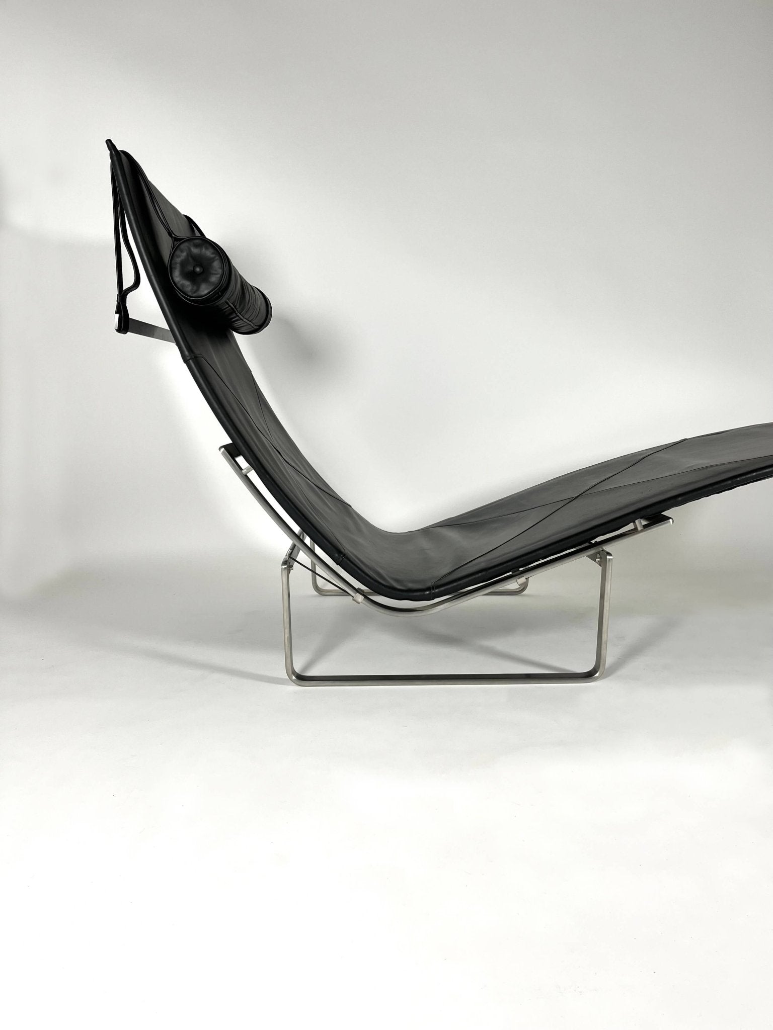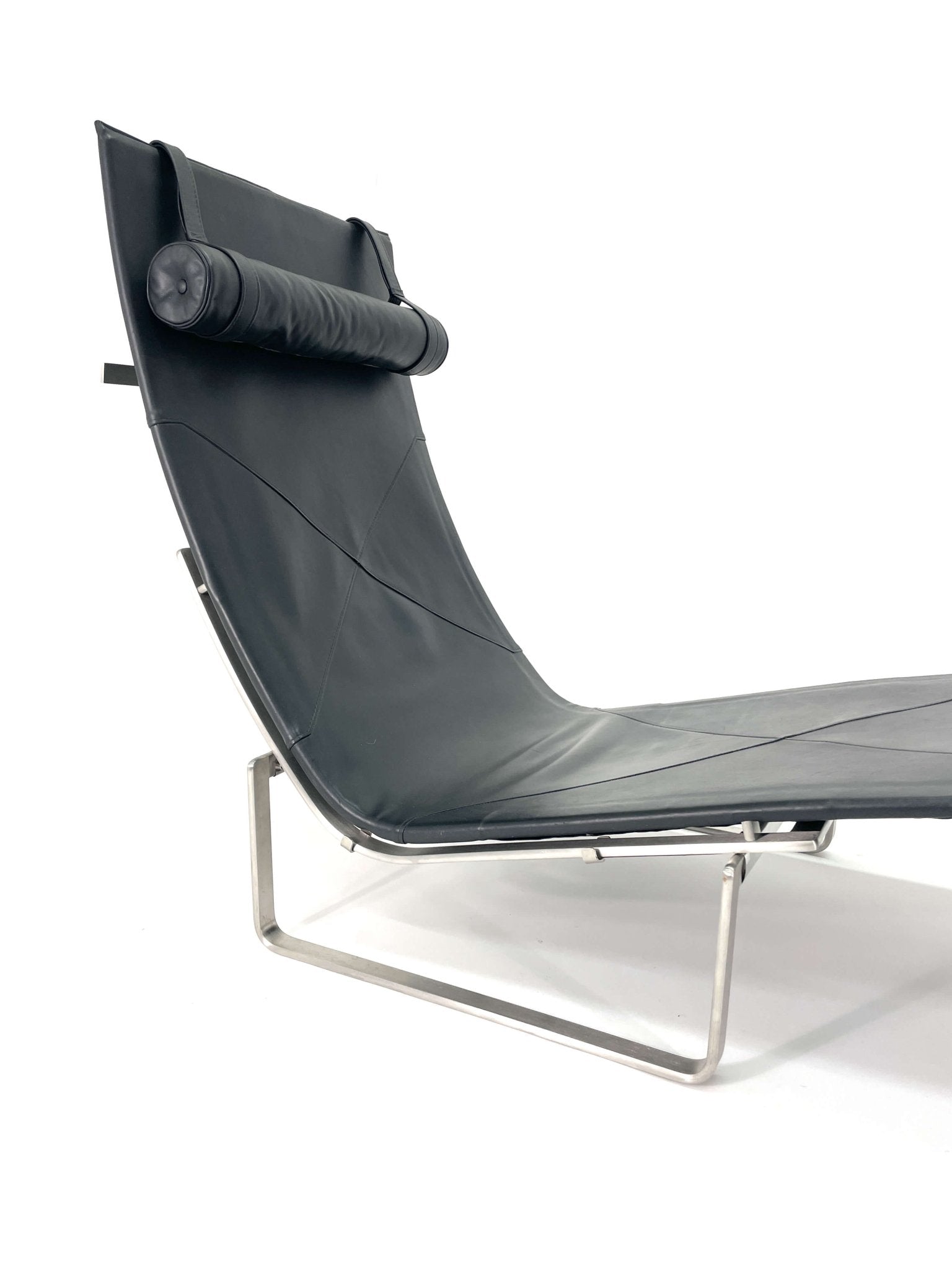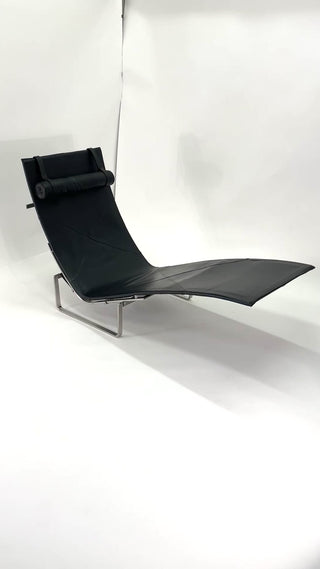 Poul Kjรฆrholm had a particular interest in various construction materials; especially steel, which he considered a natural material. He was a trained carpenter who continued studies at the Danish School of Arts and Crafts. He moved on to work at Fritz Hansen, for about a year, where he designed a number of noteworthy chair prototypes. In 1955, Kjรฆrholm started collaborating with manufacturer Ejvind Kold Christensen, which lasted until his death in 1980.ยThe PK24 chaise is adjustable and based on a satin-brushed stainless steel frame, it is upholstered in leather and has a matching adjustable leather headrest with a counter-weight in steel. Made with stainless steel and leatherย with two manufacturer's label on the base.