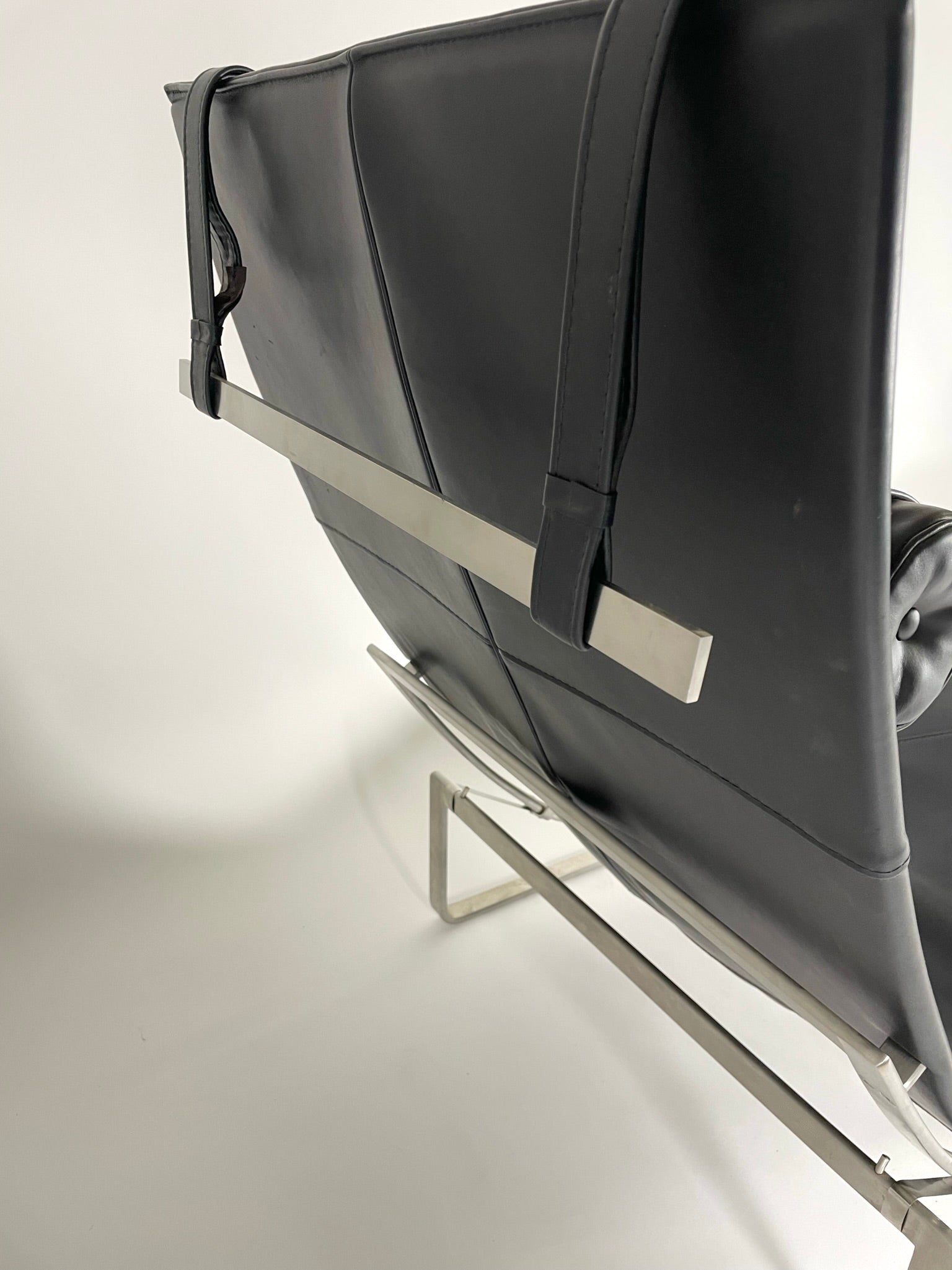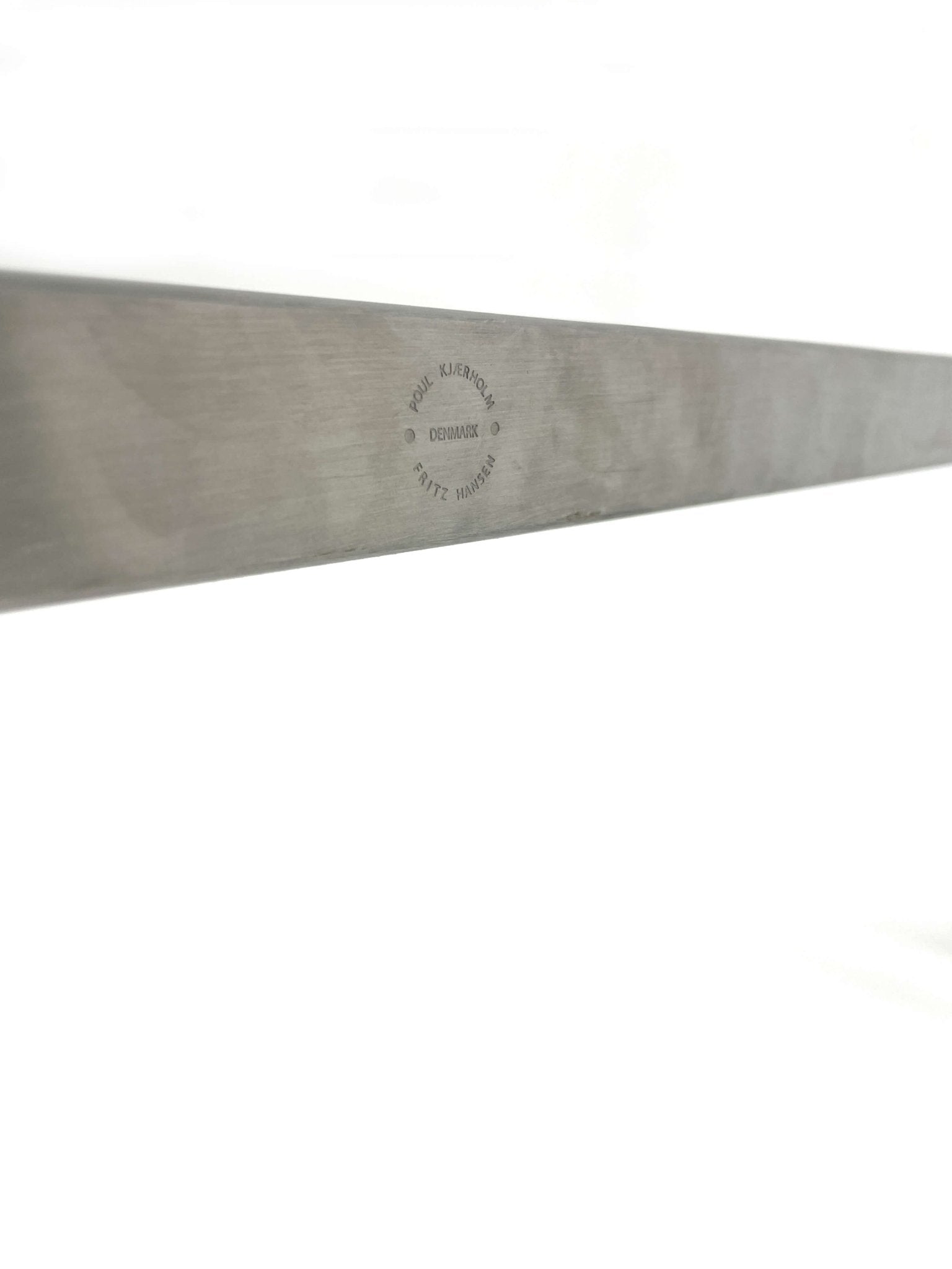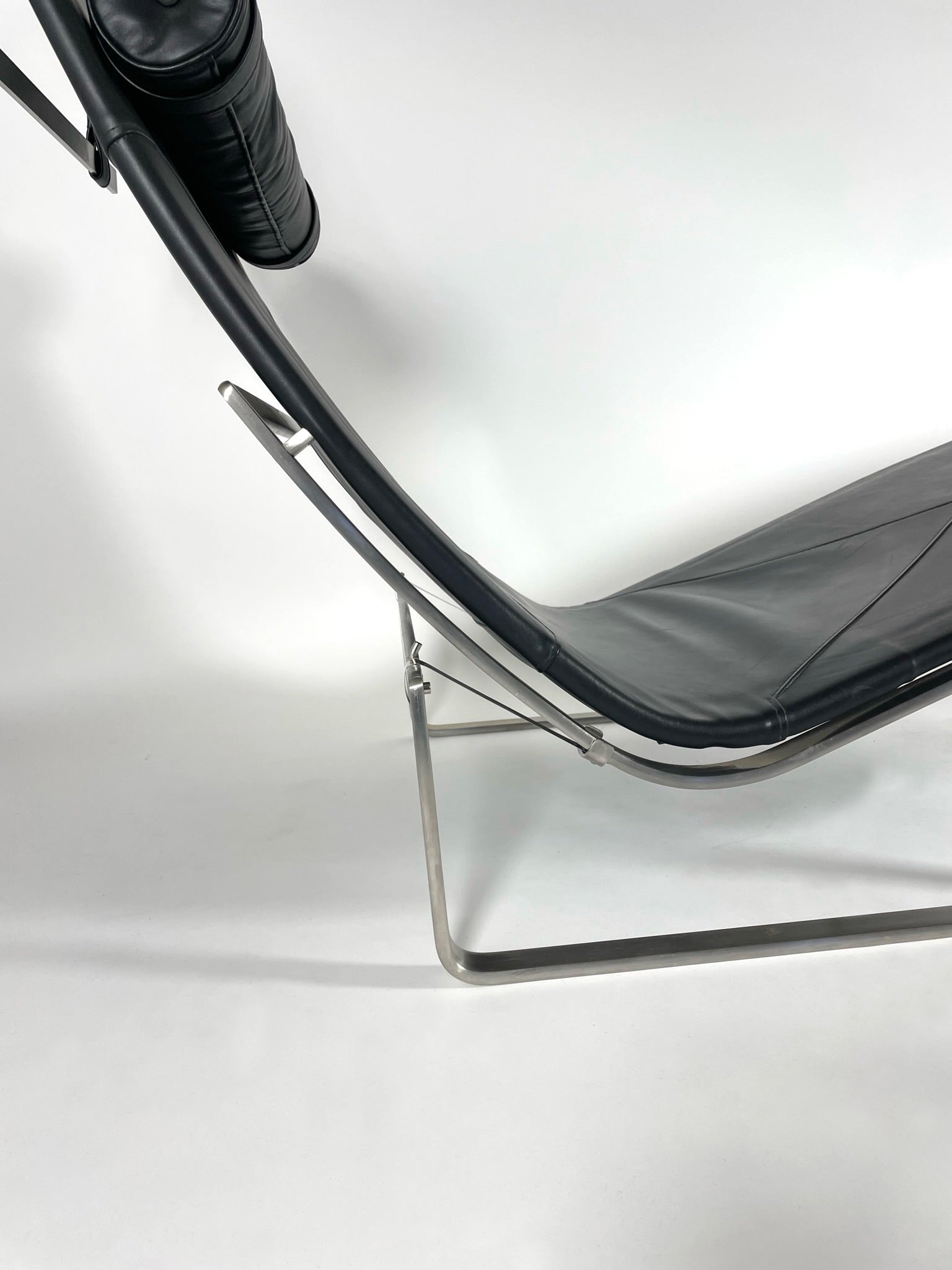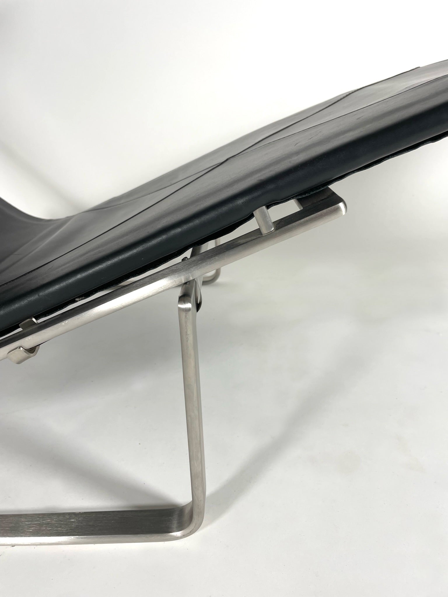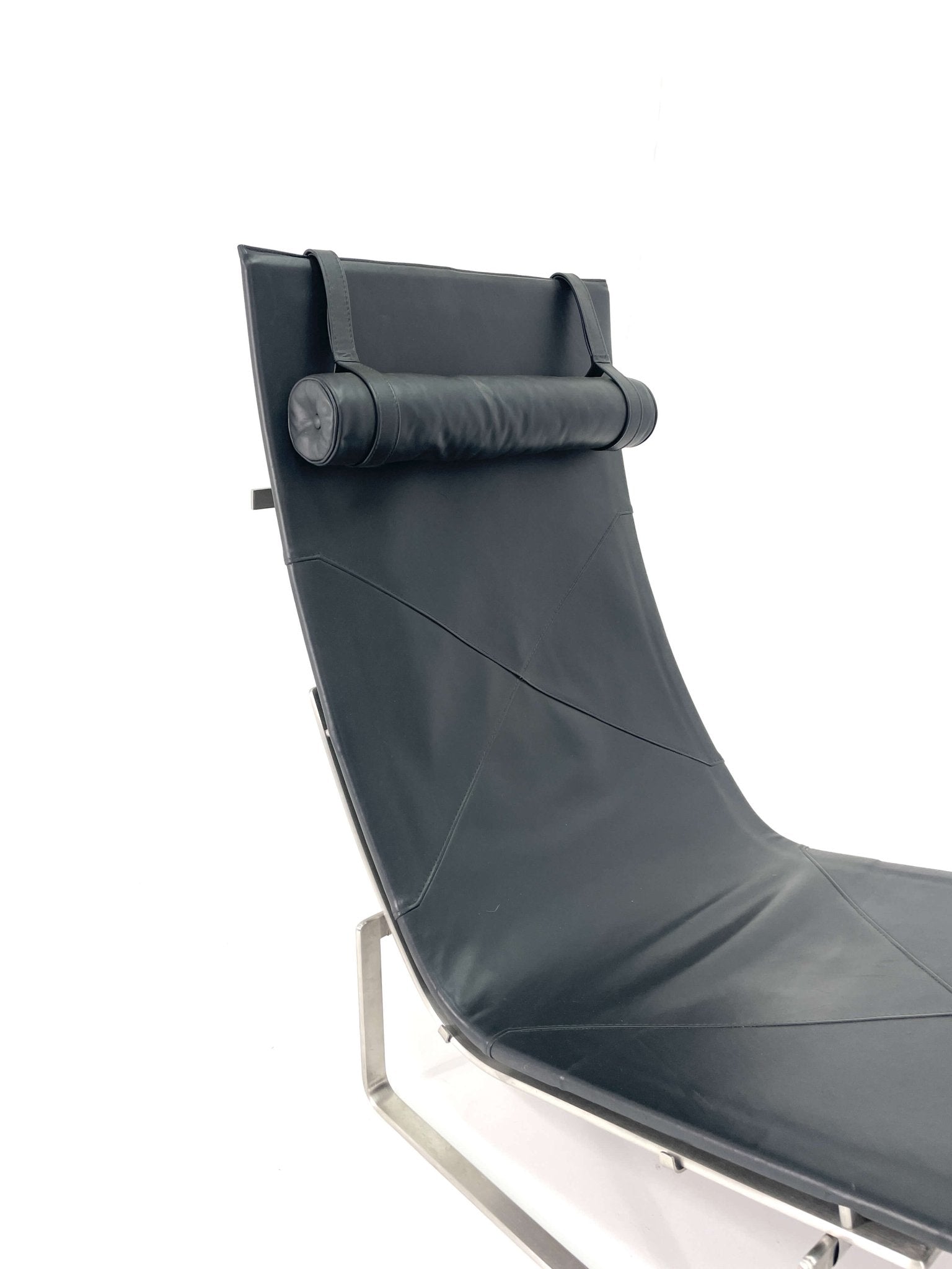 Poul Kjรฆrholm had a particular interest in various construction materials; especially steel, which he considered a natural material. He was a trained carpenter who continued studies at the Danish School of Arts and Crafts. He moved on to work at Fritz Hansen, for about a year, where he designed a number of noteworthy chair prototypes. In 1955, Kjรฆrholm started collaborating with manufacturer Ejvind Kold Christensen, which lasted until his death in 1980.ยThe PK24 chaise is adjustable and based on a satin-brushed stainless steel frame, it is upholstered in leather and has a matching adjustable leather headrest with a counter-weight in steel. Made with stainless steel and leatherย with two manufacturer's label on the base.