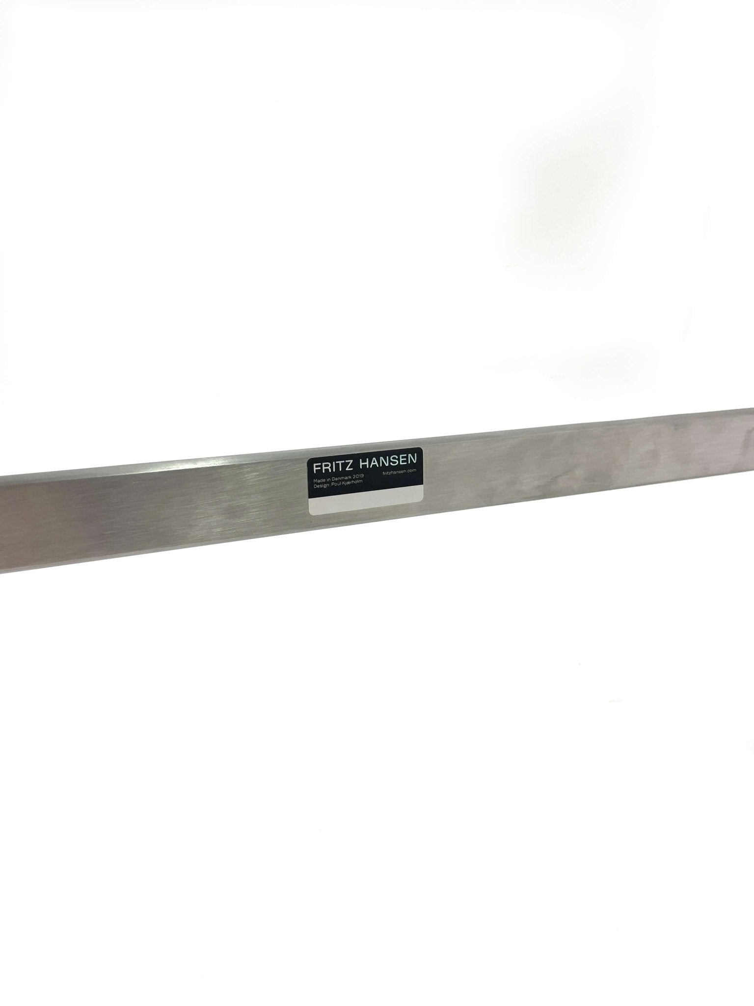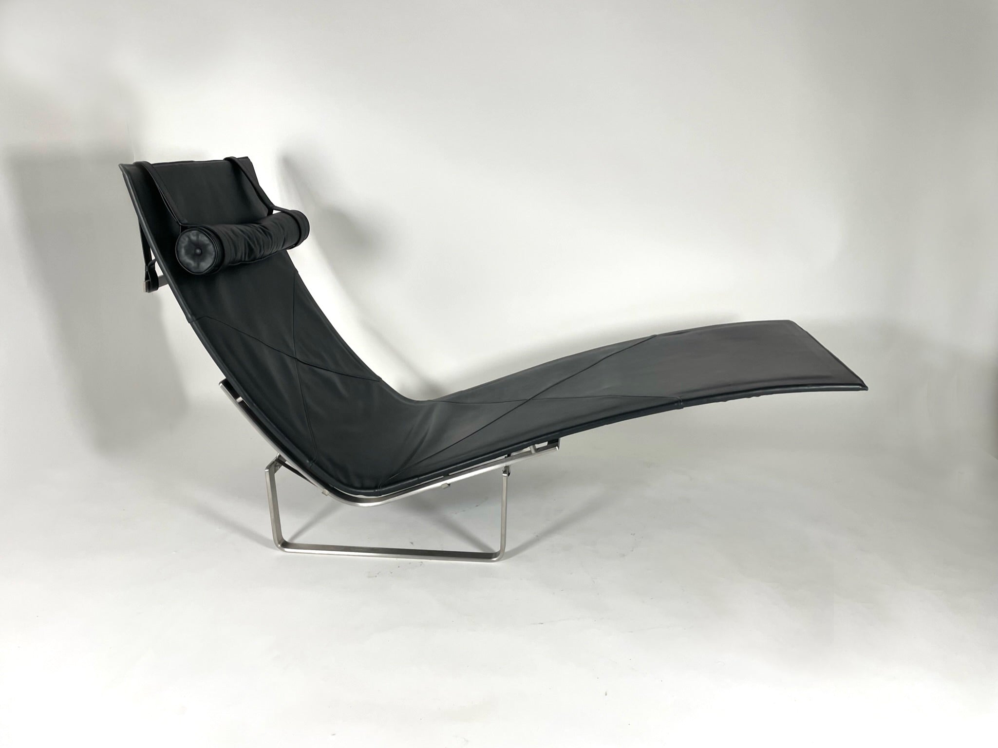 This vintage PK24 chaise lounge from Fritz Hansen's "Poul Kjaerholm collection". Simple elegance, a typical Kjรฆrholm design - with the combination of steel and leather with an adjustable, leather headrest - in an exclusive and minimalist design. The discrete and elegant PK24 chaise stands as an icon for Poul Kjรฆrholm's work.