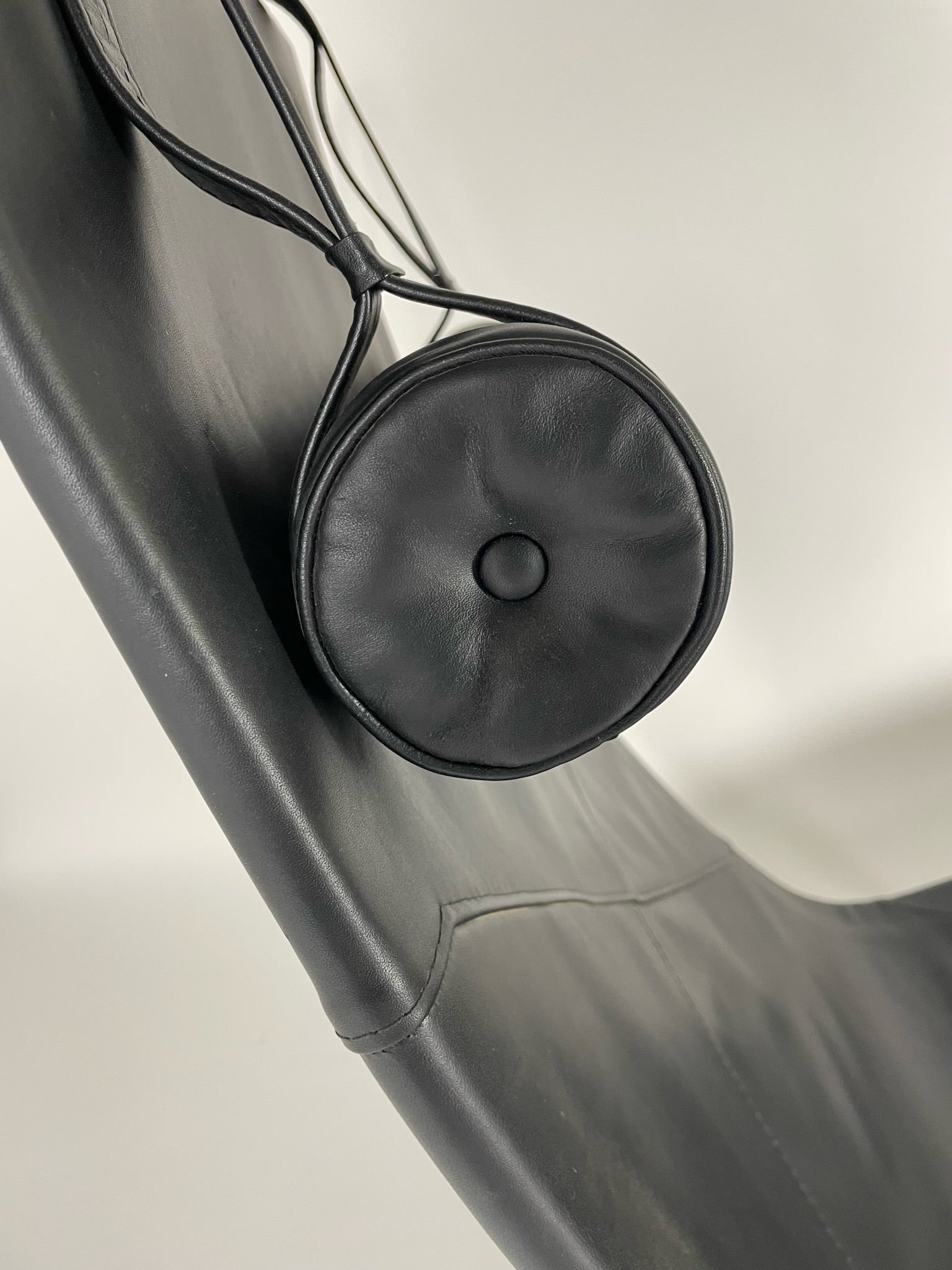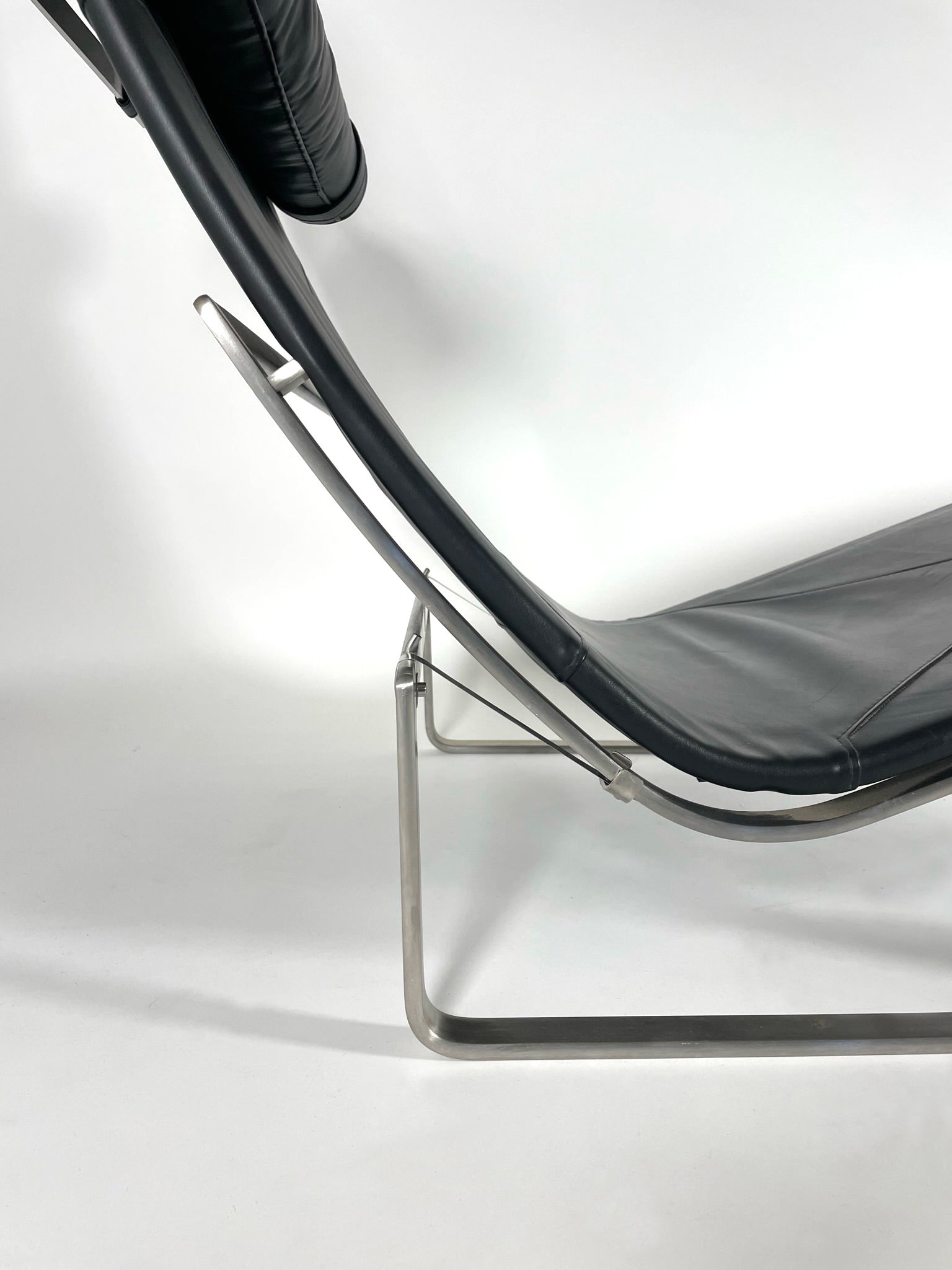 The PK24 chaise is adjustable and based on a satin-brushed stainless steel frame, it is upholstered in leather and has a matching adjustable leather headrest with a counter-weight in steel. Made with stainless steel and leatherย with two manufacturer's label on the base.