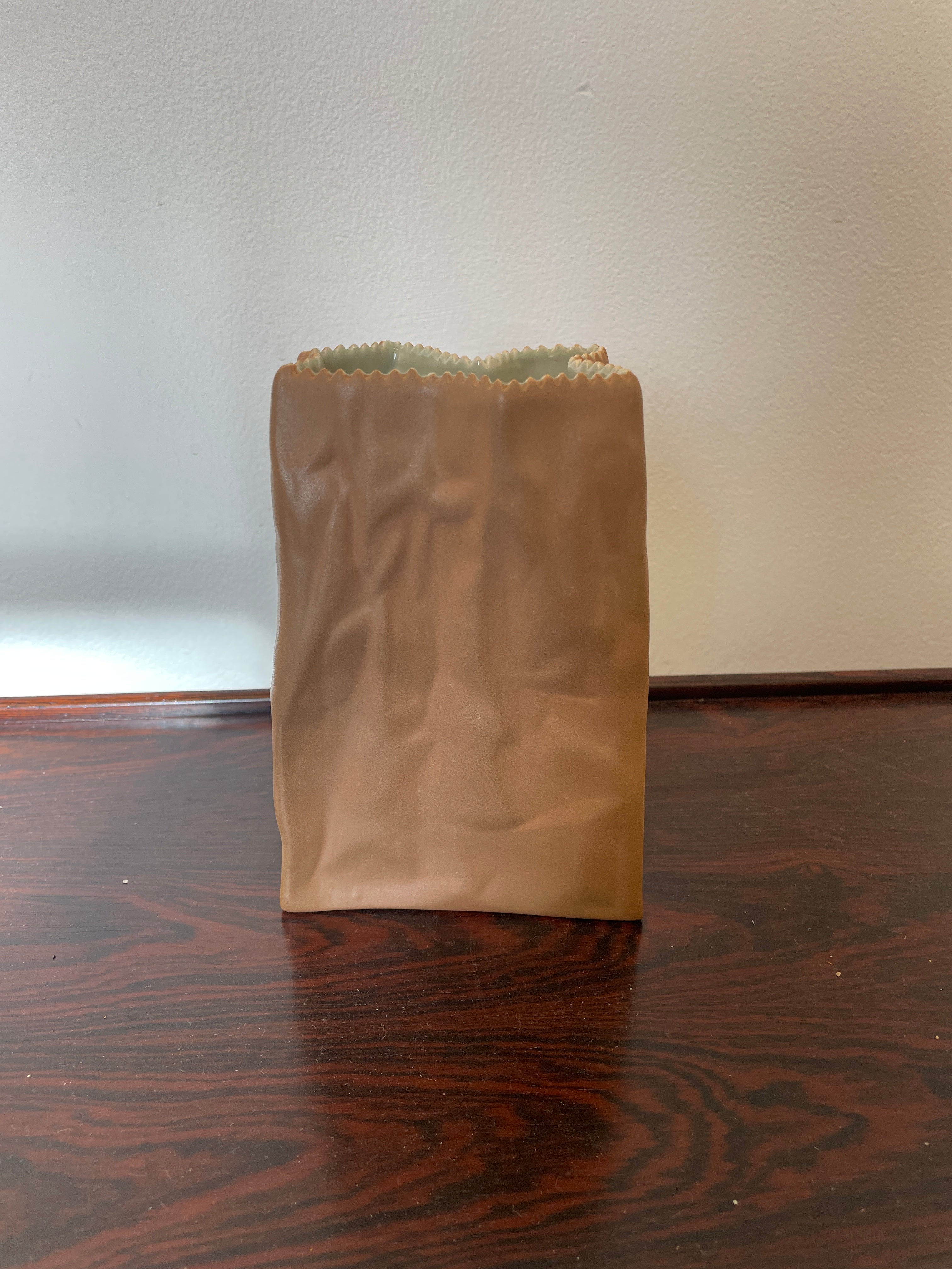 Small brown bag porcelain vase by Tapio Wirkalla made by Rosenthal in Germany. Very charming piece which is sure to be a conversation piece. White porcelain glaze on the inside. Marked on bottom Rosenthal.