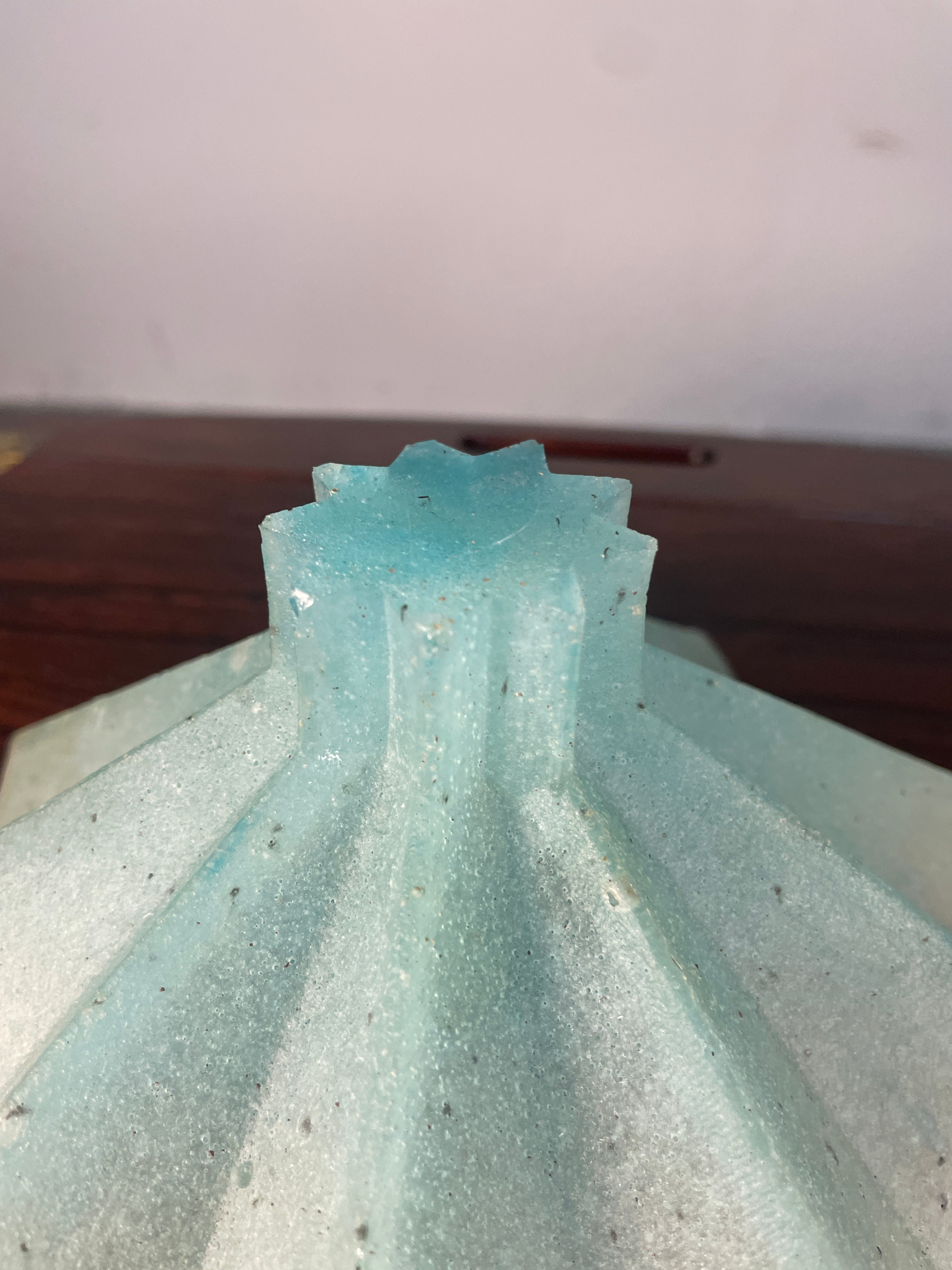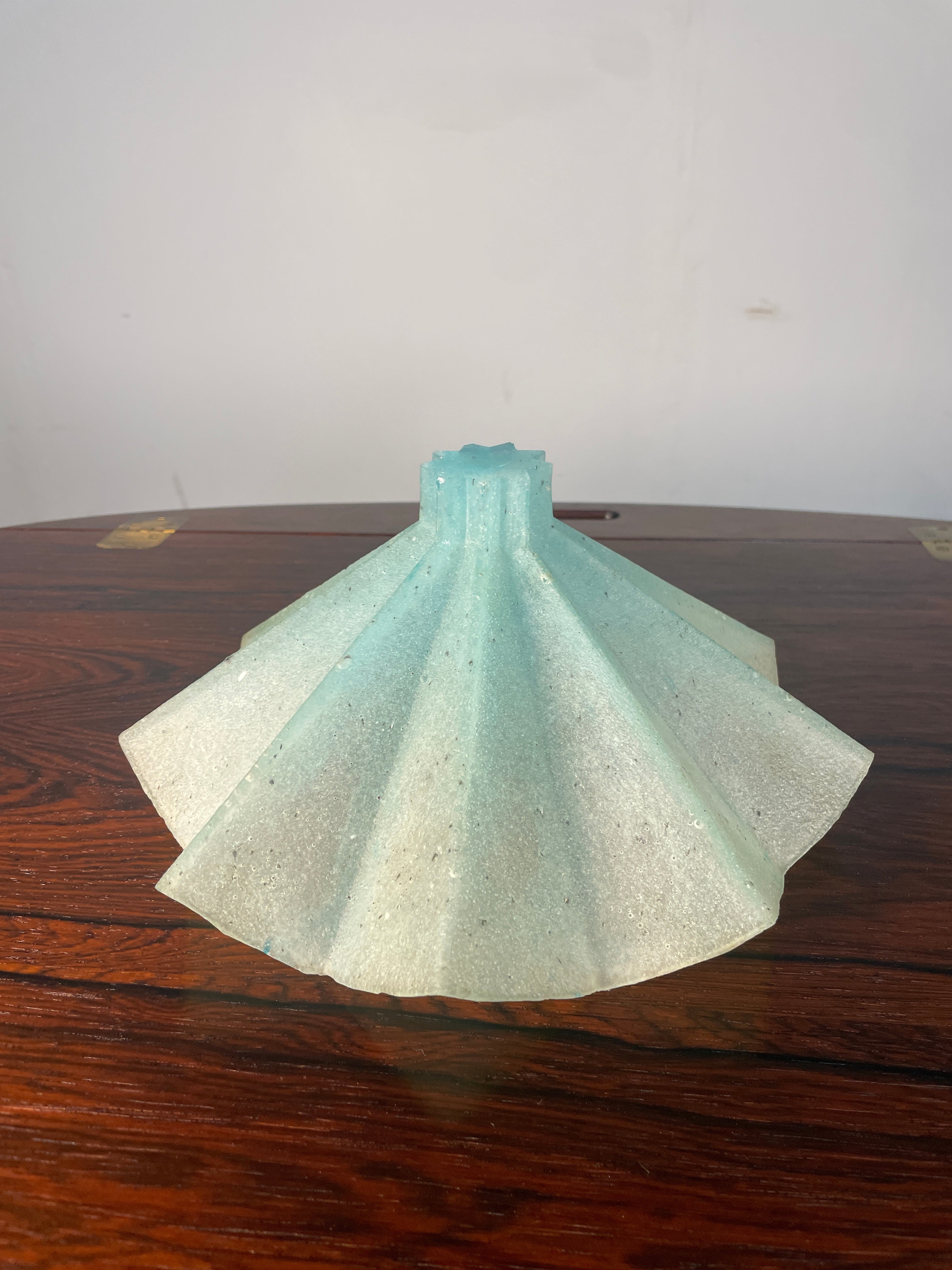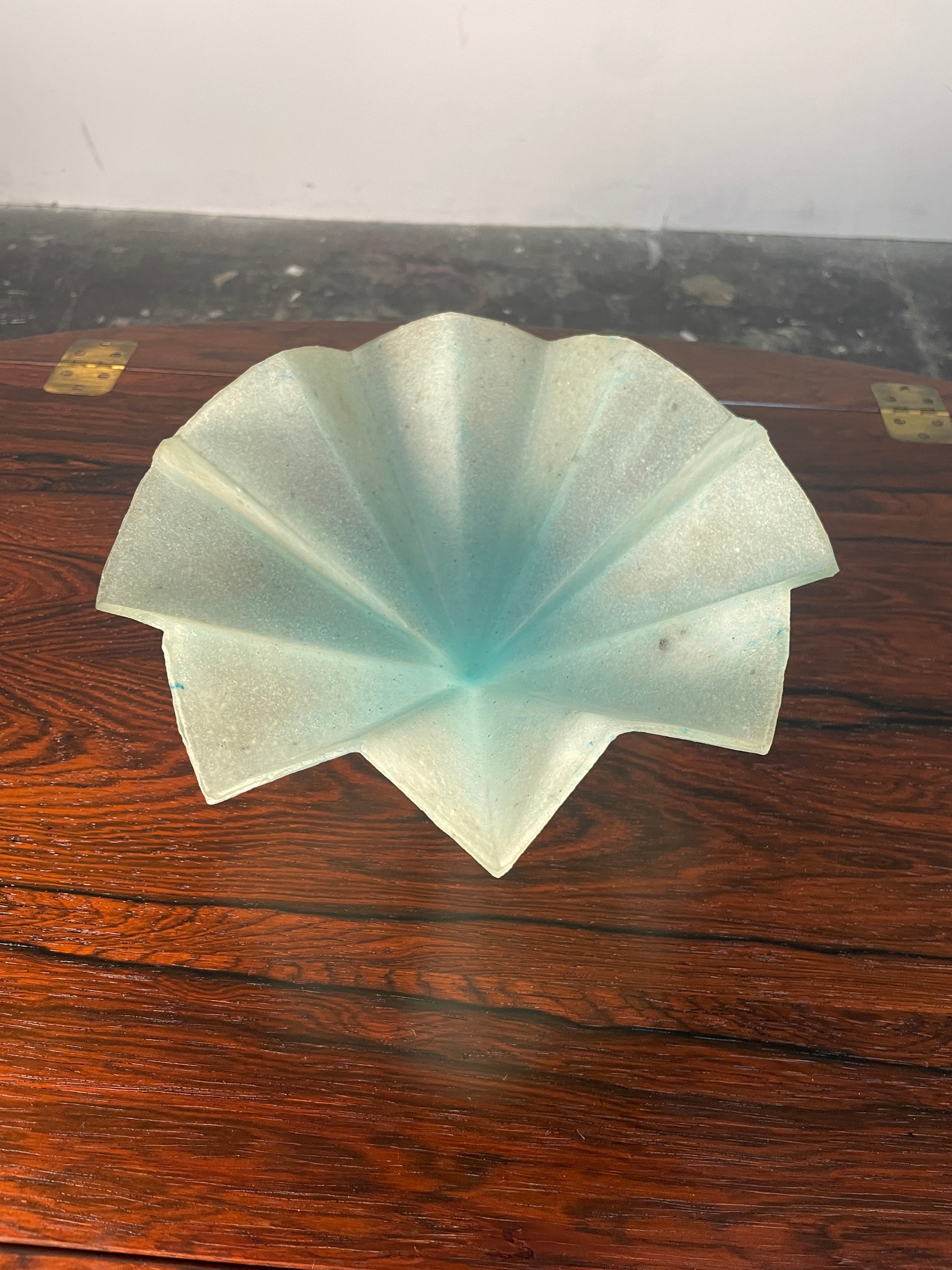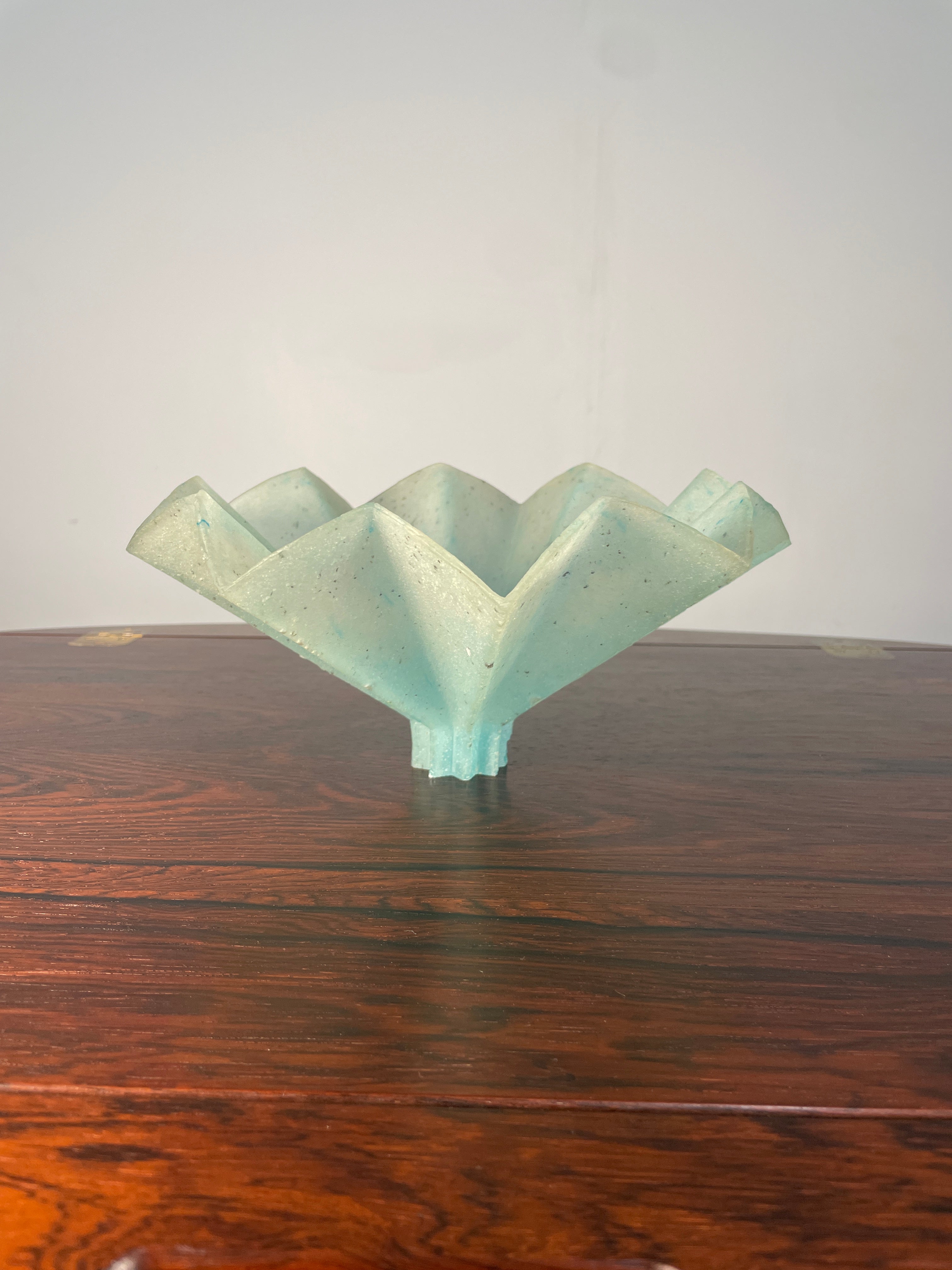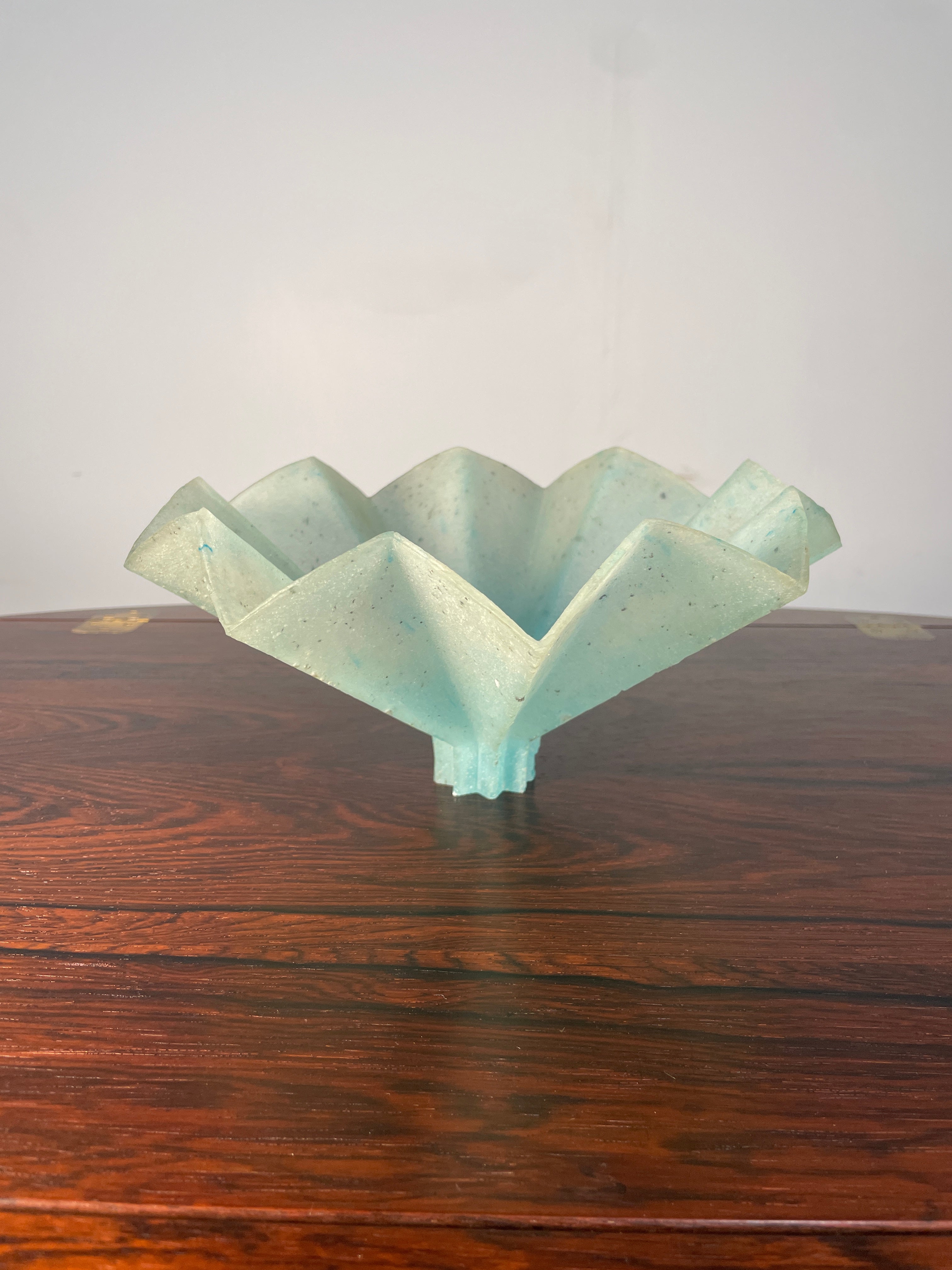 Tessa Clegg pale blue/green frosted glass dish with geometric rim. The piece has black specks in the glass and finish- these are intentional and original to the piece. Signature etched in the bottom. Very rare to see her work in the USA.Dimensions: 10D x 4.75 HAbout the Artist: