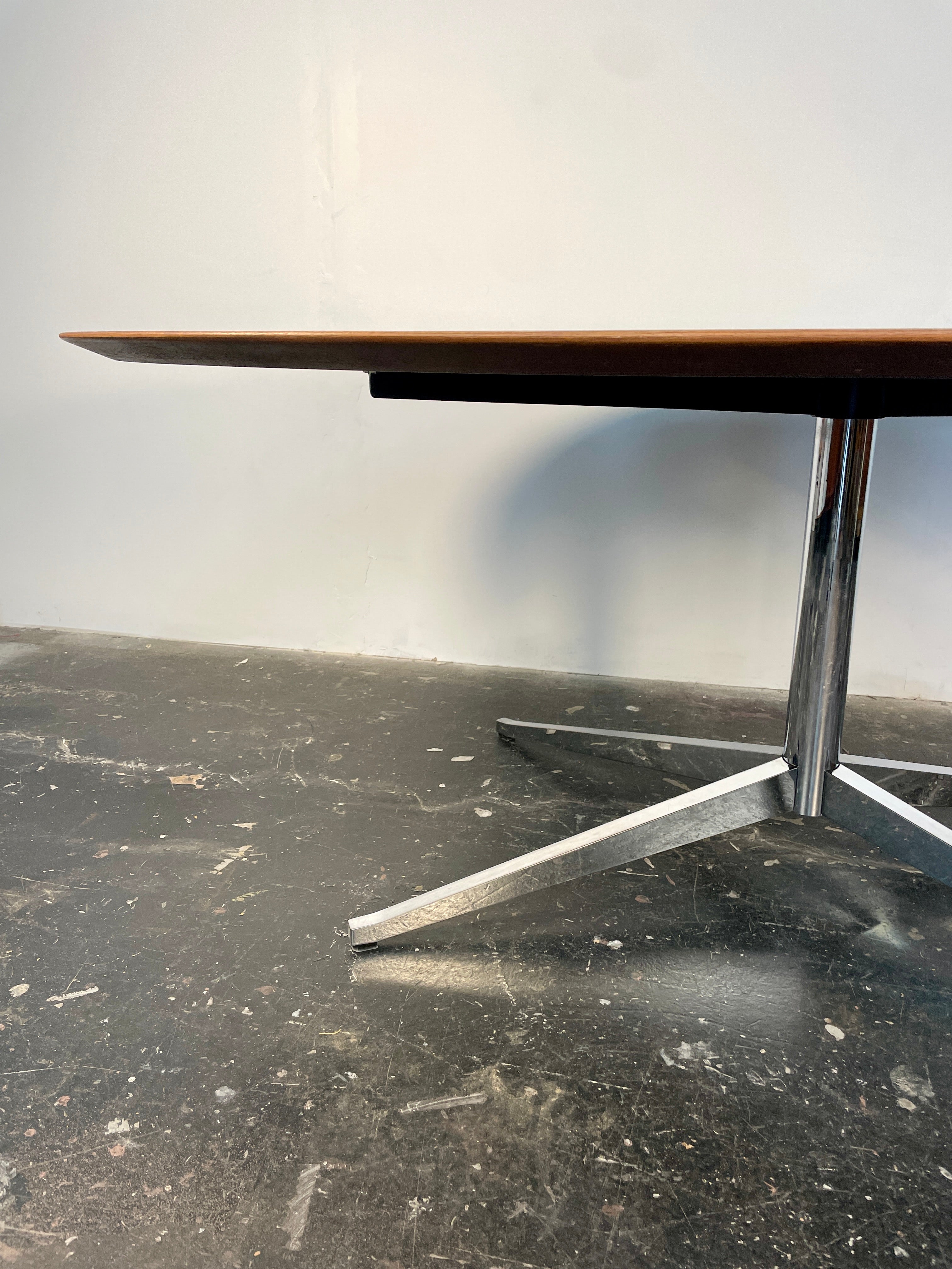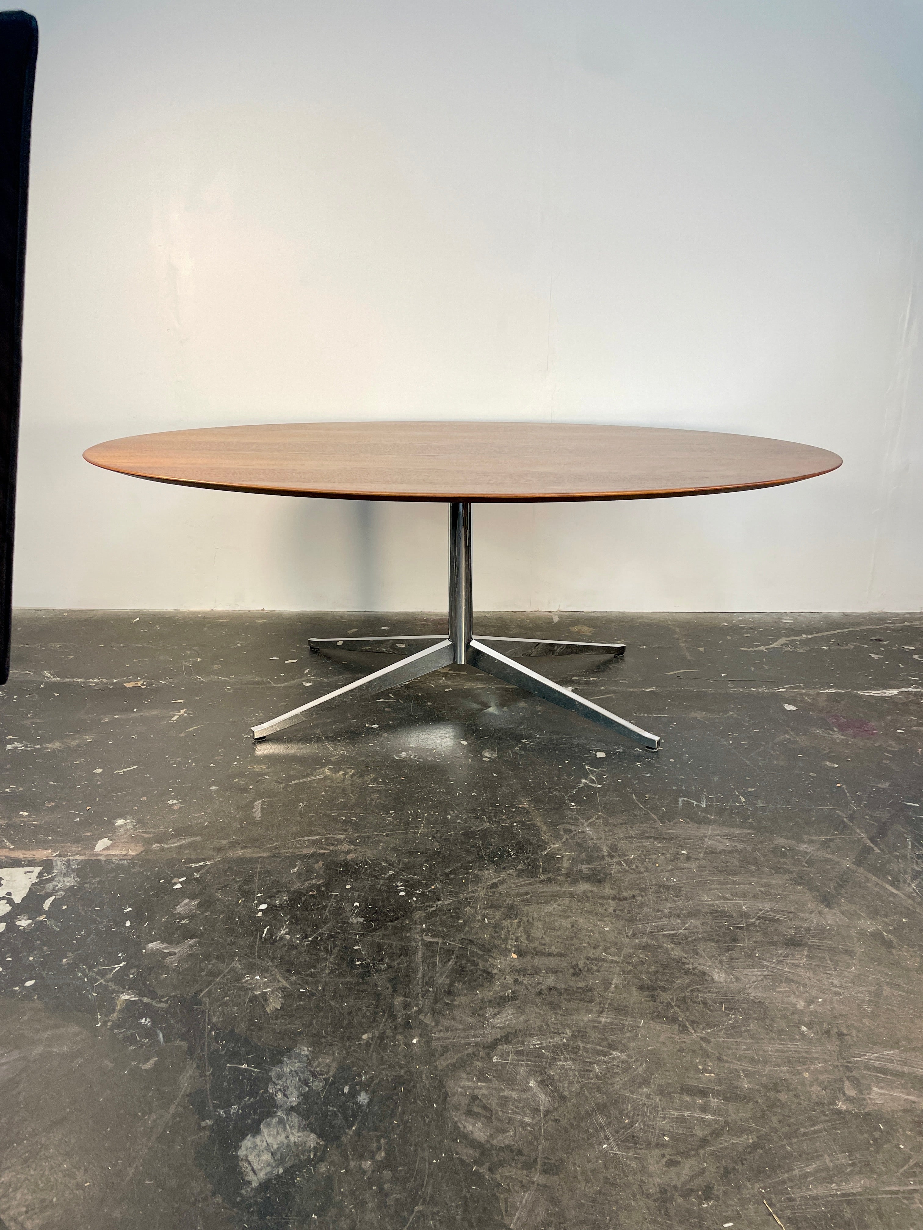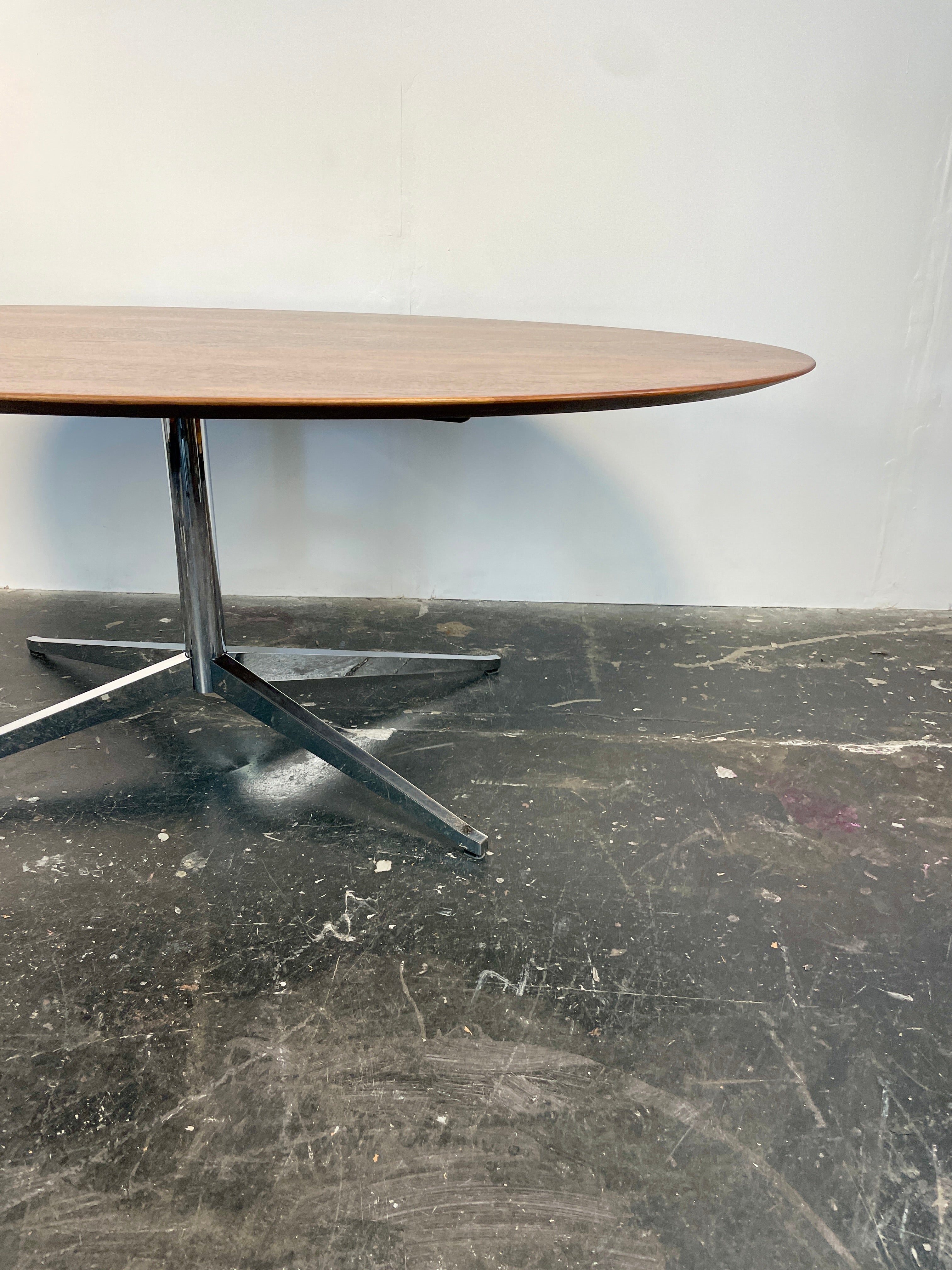 Versatile iconic table designed by Florence Knoll for Knoll International in the United States circa 1960s. This design features an oval walnut wood top that sits over a chromed metal four-star base perfectly proportioned to stand the test of time. Incredibly versatile table because you can fit more chairs around it due to the lack of leg posts. Can easily fit 6-10 people around this table. Knoll tag attached at the base.ย