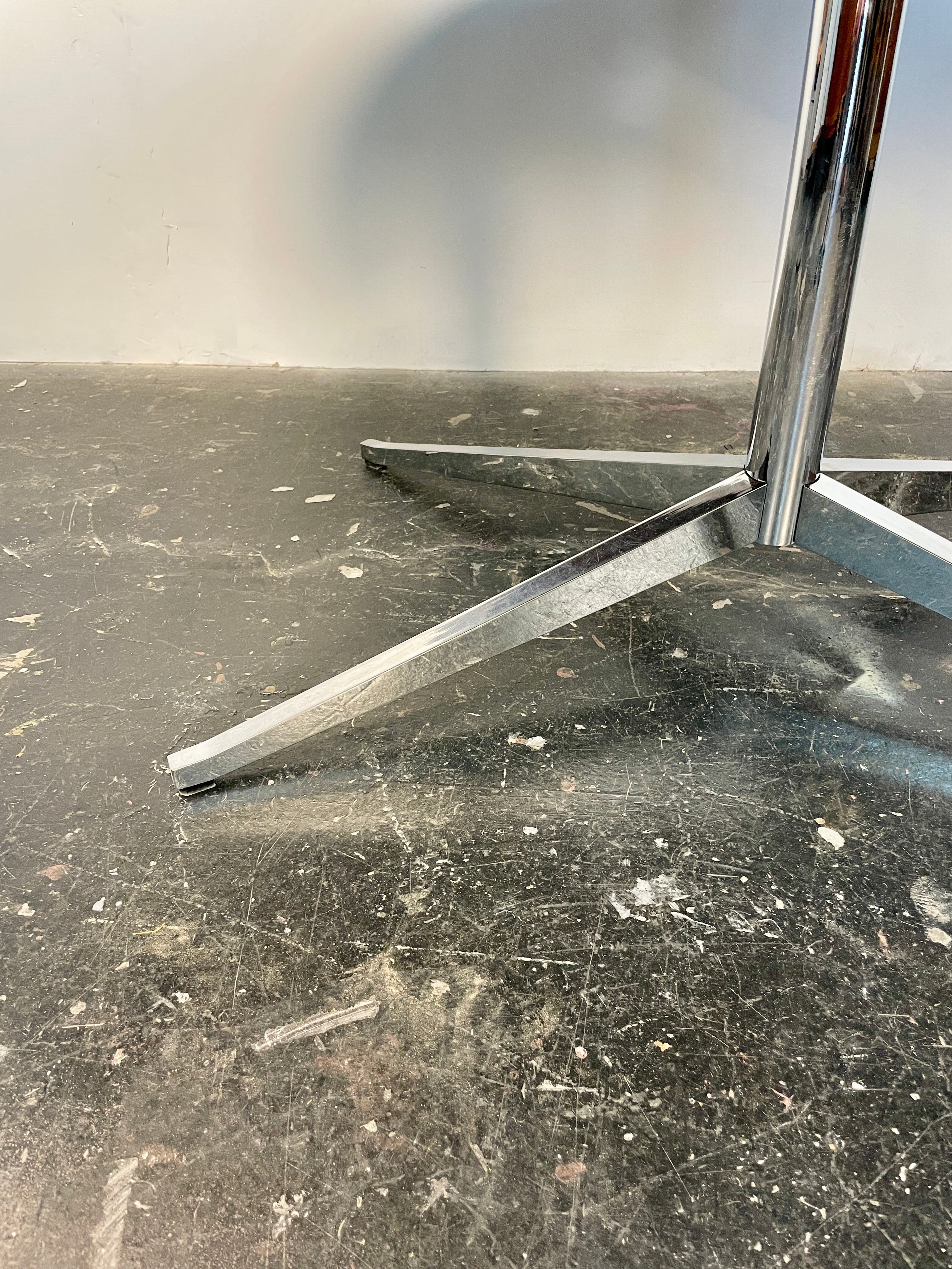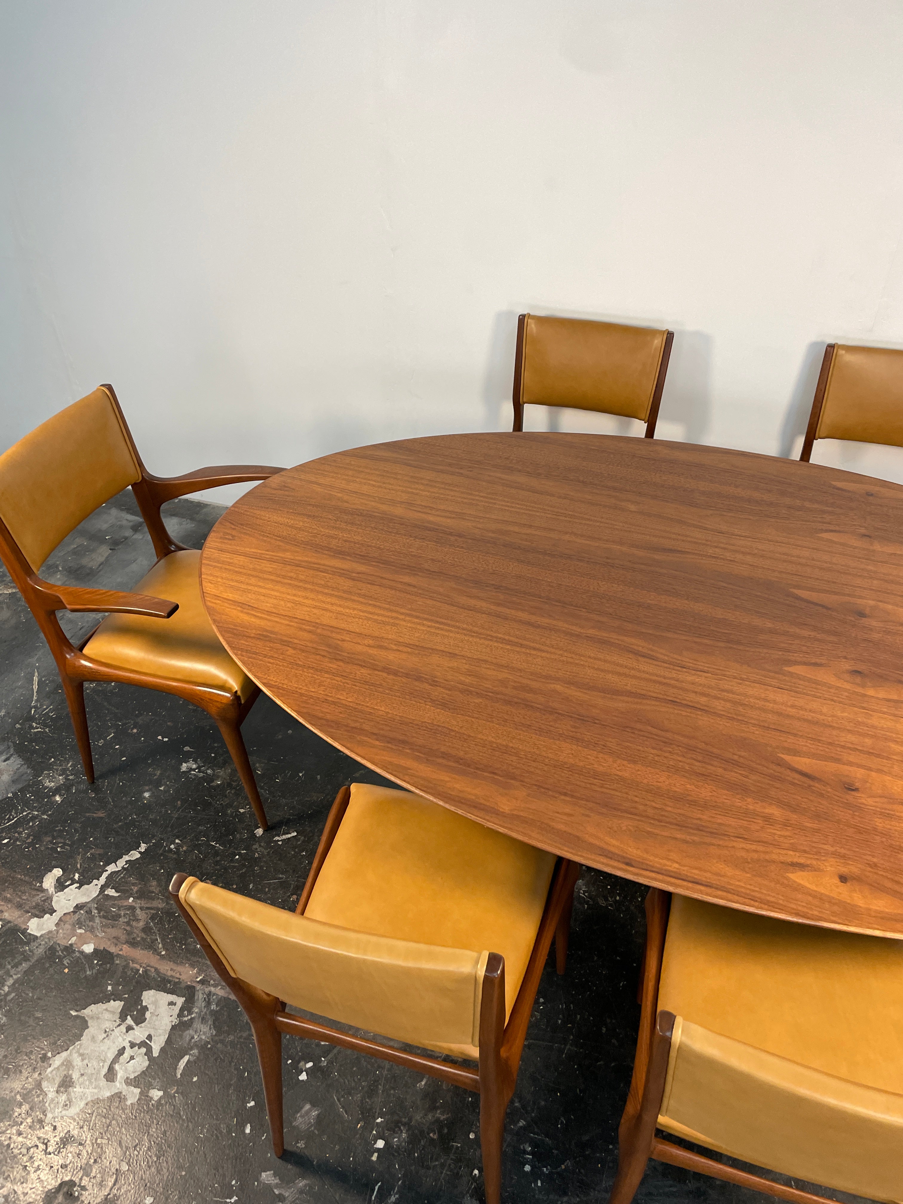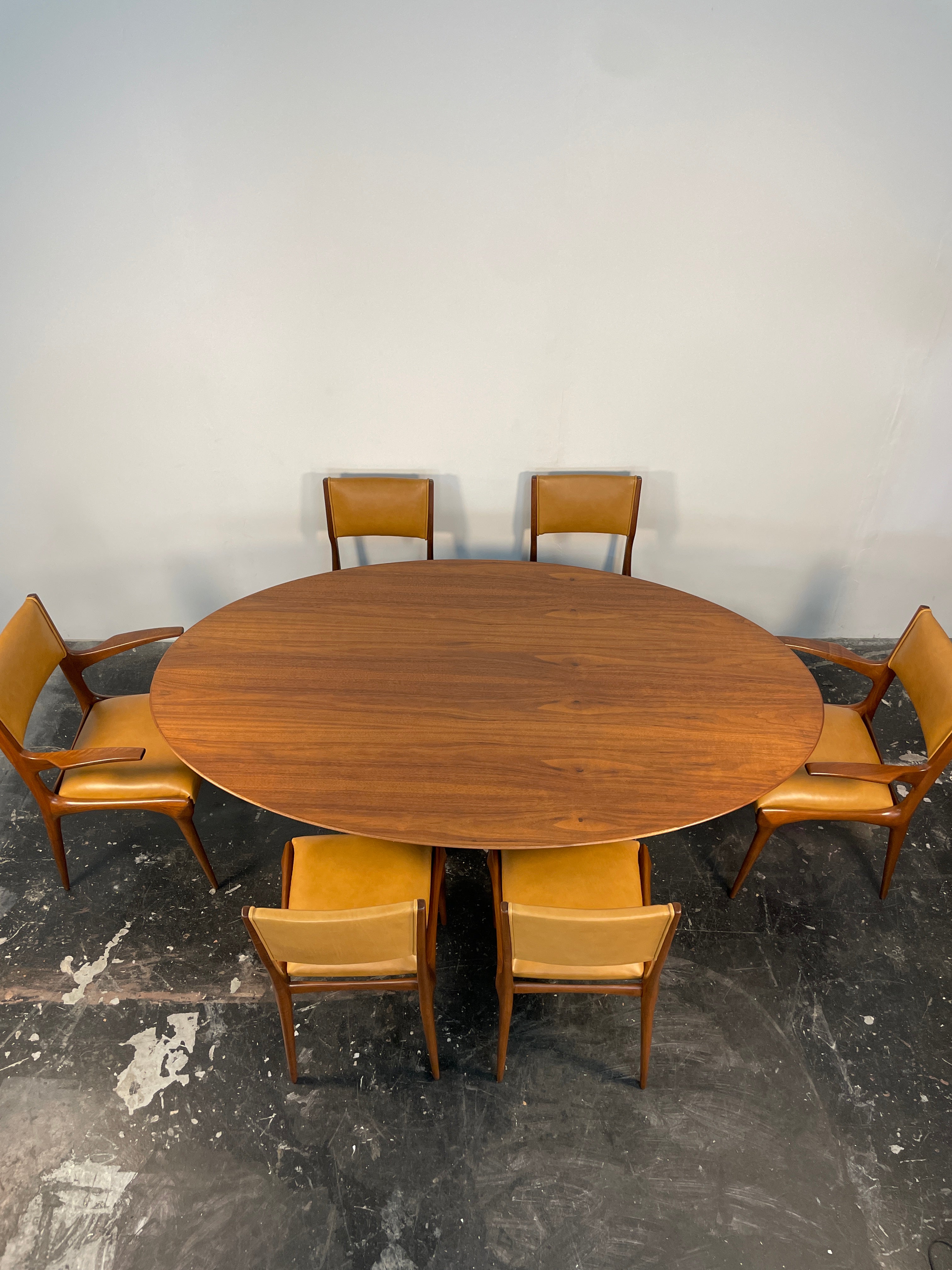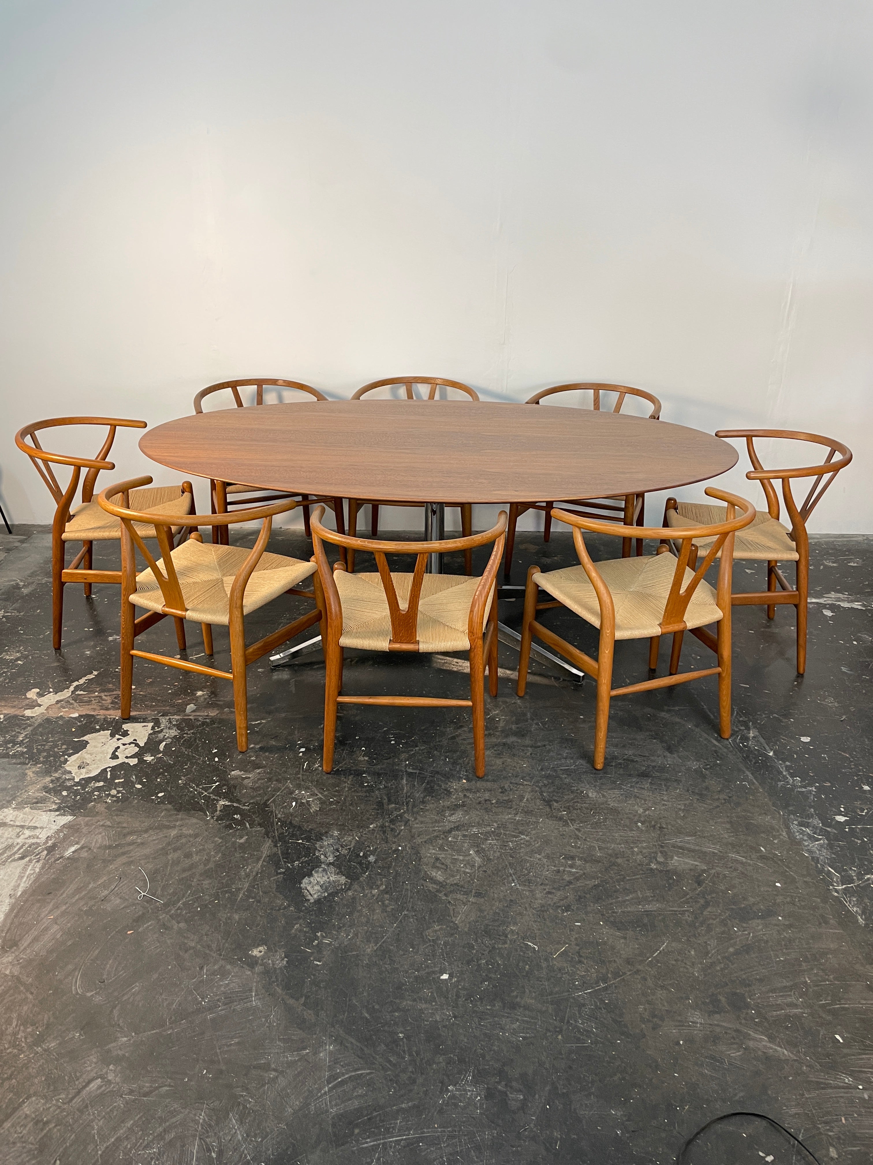 Versatile iconic table designed by Florence Knoll for Knoll International in the United States circa 1960s. This design features an oval walnut wood top that sits over a chromed metal four-star base perfectly proportioned to stand the test of time. Incredibly versatile table because you can fit more chairs around it due to the lack of leg posts. Can easily fit 6-10 people around this table. Knoll tag attached at the base.ย