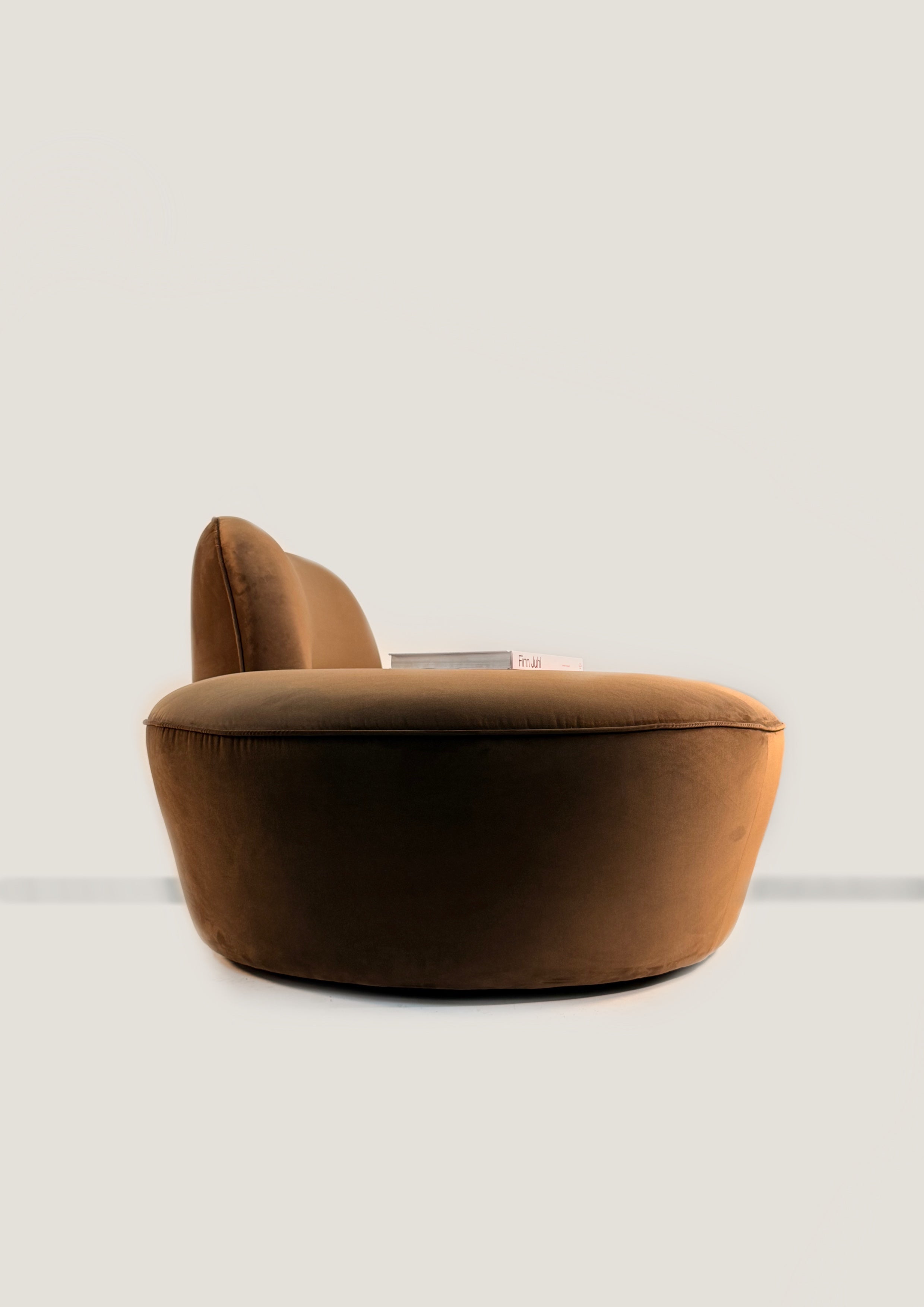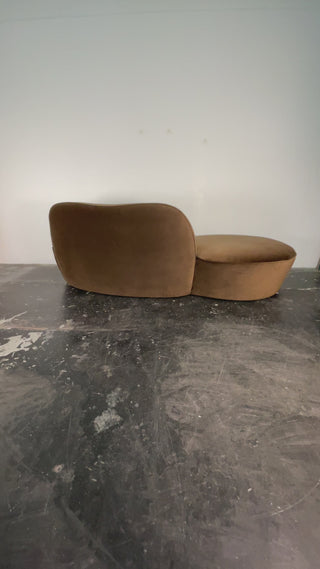 A stunning Zoe sofa by Vladimir Kagan for American Leather. This piece has been masterfully reupholstered in a sumptuous golden brown velvet. It will elevate any interior space with is curvaceous form and warm, inviting upholstery. Float it in a room, angle it in a corner.