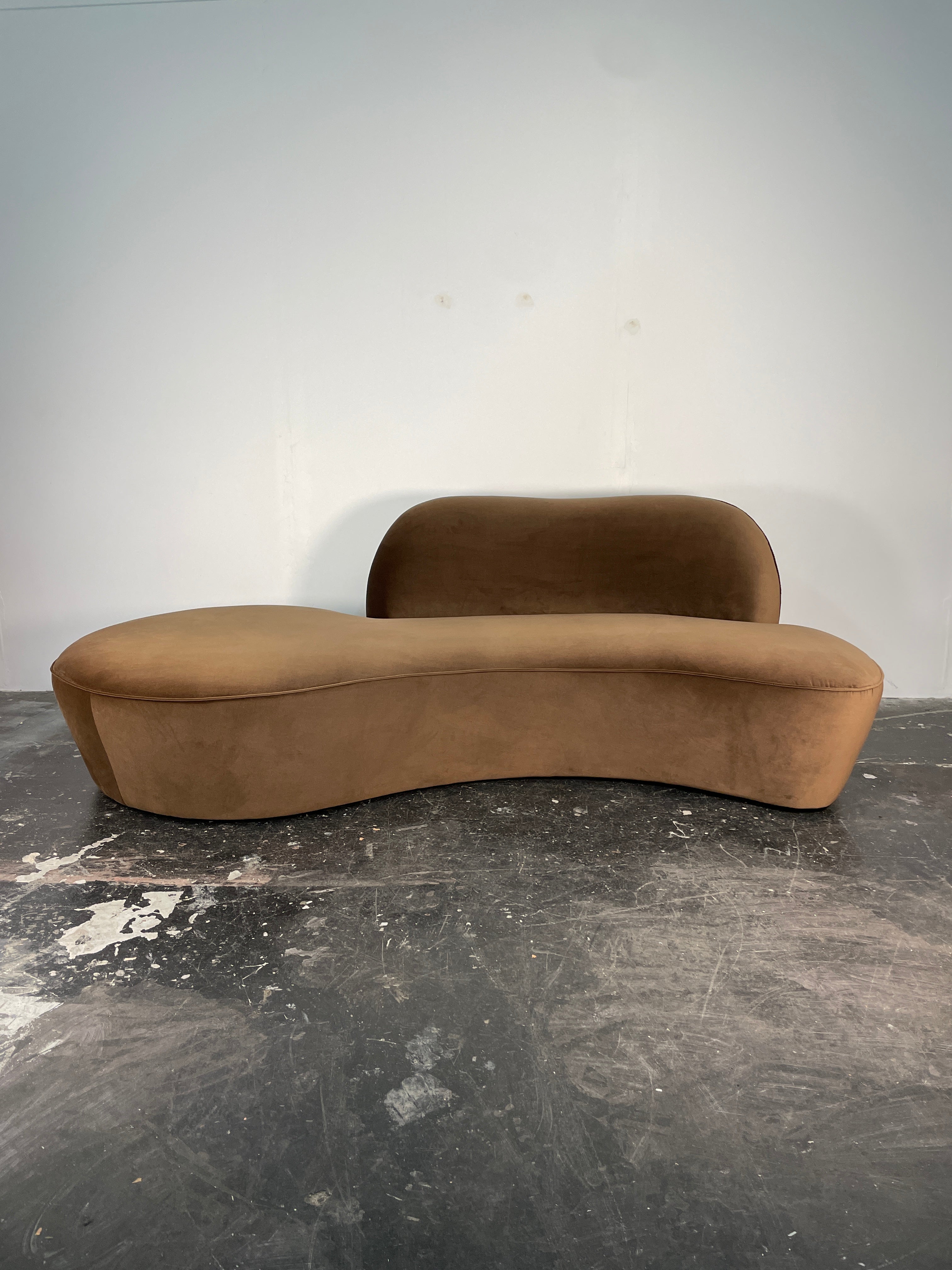 Vladimir Kagan's genius is exhibited in the organic design of the Zoe sofa for American Leather. The asymmetrical curves invite you to drape yourself over it. We upholstered in a warm chocolate which layers richness and highlights its soft design.